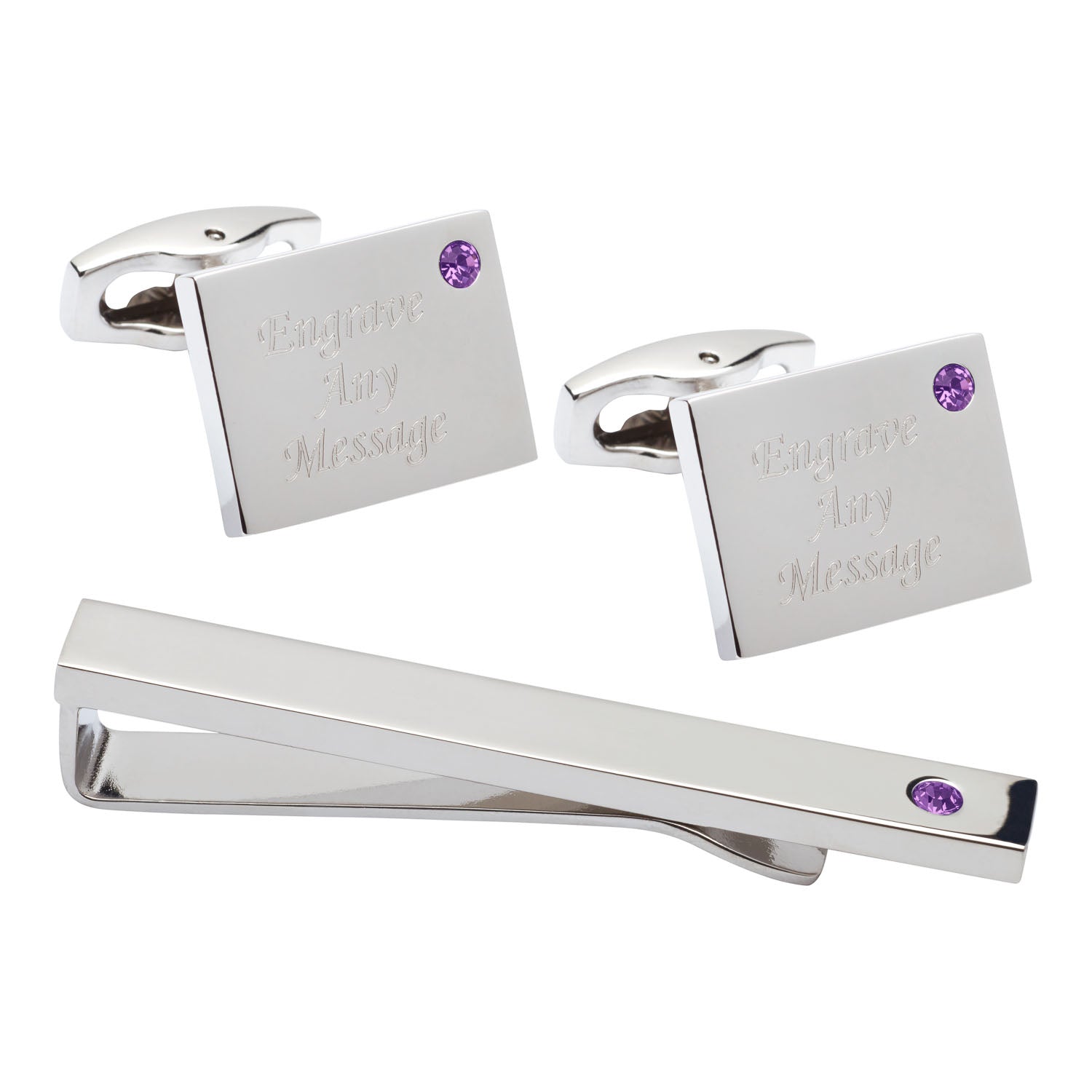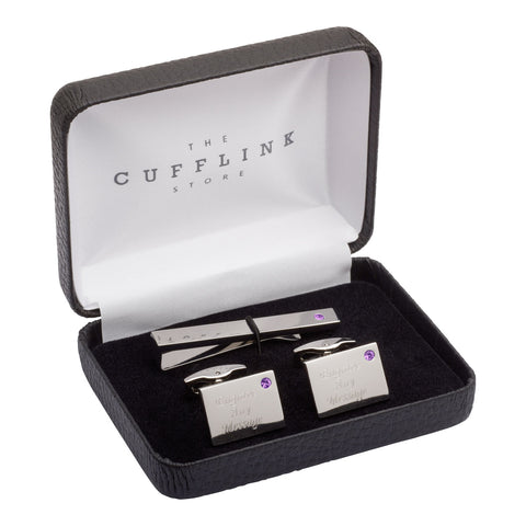 Luxury silver plated cufflinks & tie bar set with an Amethyst coloured stone for February birth month. Choose up to 21 characters on each cufflink to make a fantastic personalised gift. Traditionally engraved in house by our master engravers. Luxury velvet lined cufflink & tie bar box included. Dimensions - 19mm x 14mm - 50mm x 5mm