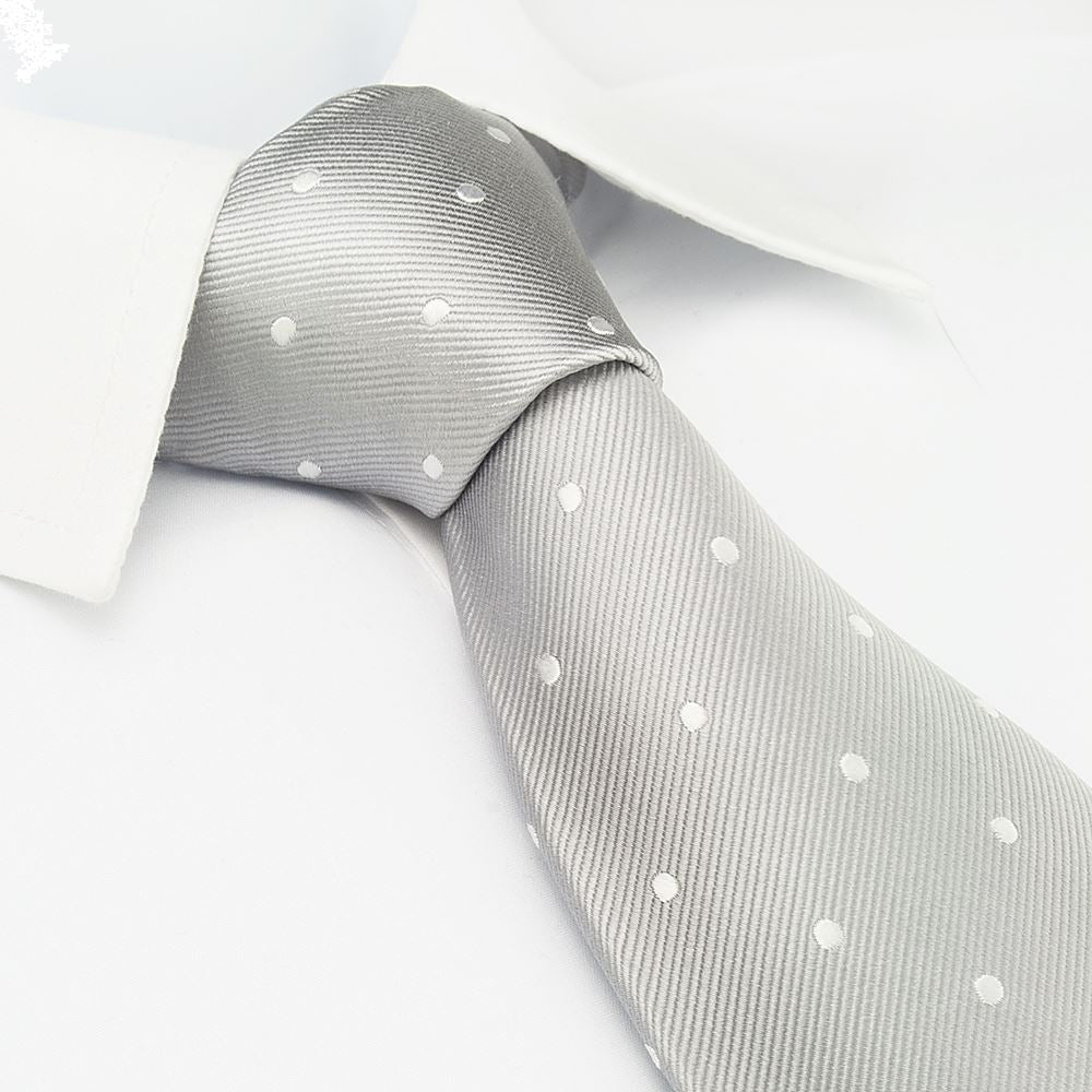 Silver Polka Dot Woven Silk Tie - This classic polka tie is a great addition to your tie collection. Made using 100% luxury woven silk and featuring a timeless spotted design. 100% Silk Dimensions: 8.0cm x 148cm