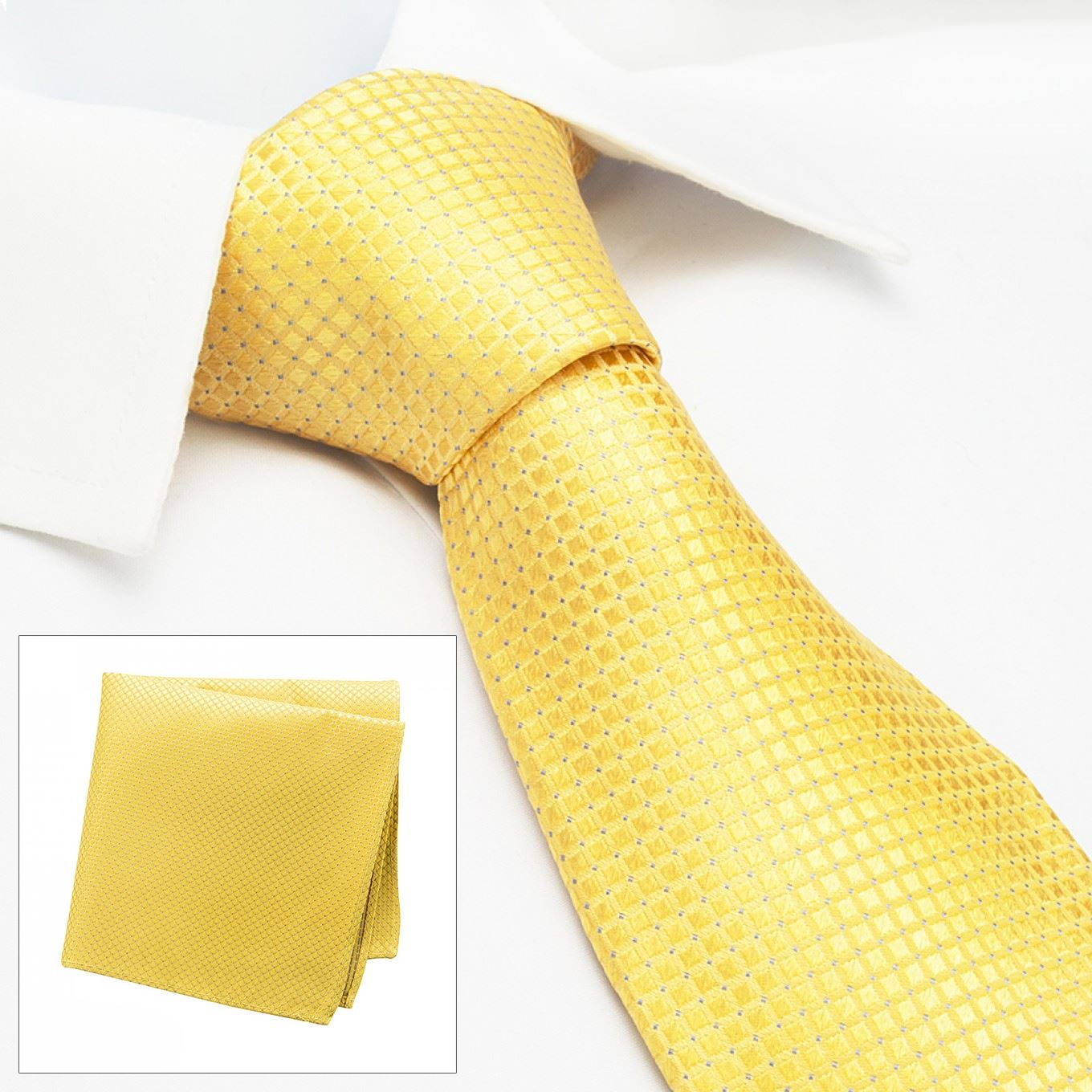 Gold Micro Square Woven Silk Tie and Handkerchief Set - Made using 100% fine silk, this beautiful matching tie and handkerchief set is hugely popular for weddings and special occasions. Tie Dimensions: 8.0cm x 148cm Handkerchief Dimensions: 30cm x 30cm