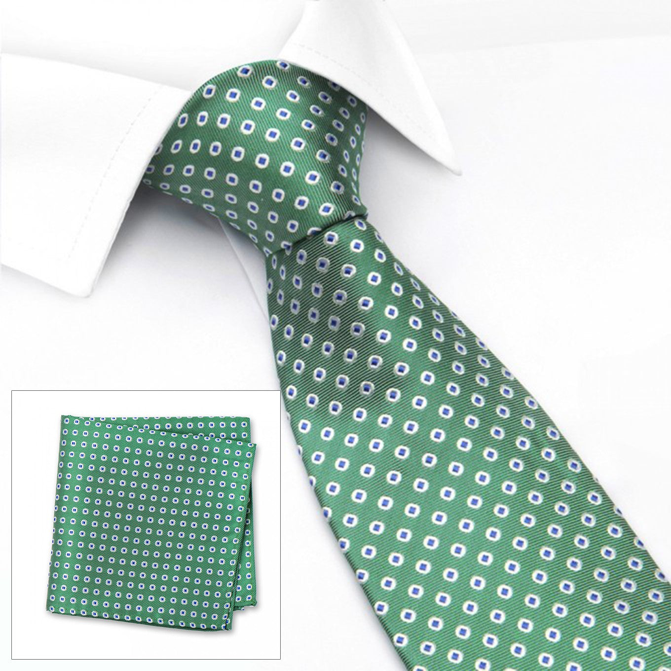 Green and Blue Classic Oxford Spot Silk Tie and Handkerchief Set - Add some classic spots to your neck tie collection with this matching silk tie and handkerchief set finished in orange and blue. Perfect for weddings, special occasions or everyday business wear. Made using 100% Woven Silk Tie Dimensions: 8.0cm x 145cm Handkerchief Dimensions: 25cm x 25cm