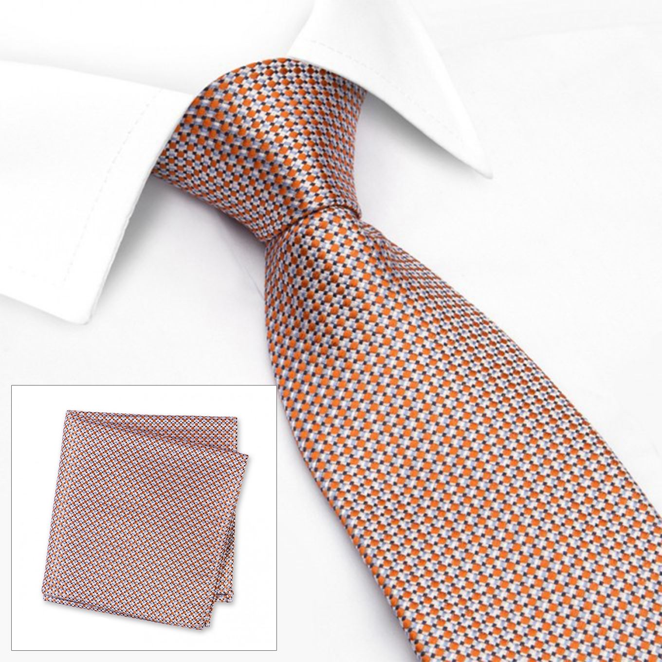 Orange Geometric Spot Woven Silk Tie and Handkerchief Set Add some patterns to your neck tie collection with this matching silk tie and handkerchief set finished in a classic geometric spot. Perfect for weddings, special occasions or everyday business wear. Made using 100% Woven Silk Tie Dimensions: 8.0cm x 145cm Handkerchief Dimensions: 25cm x 25cm