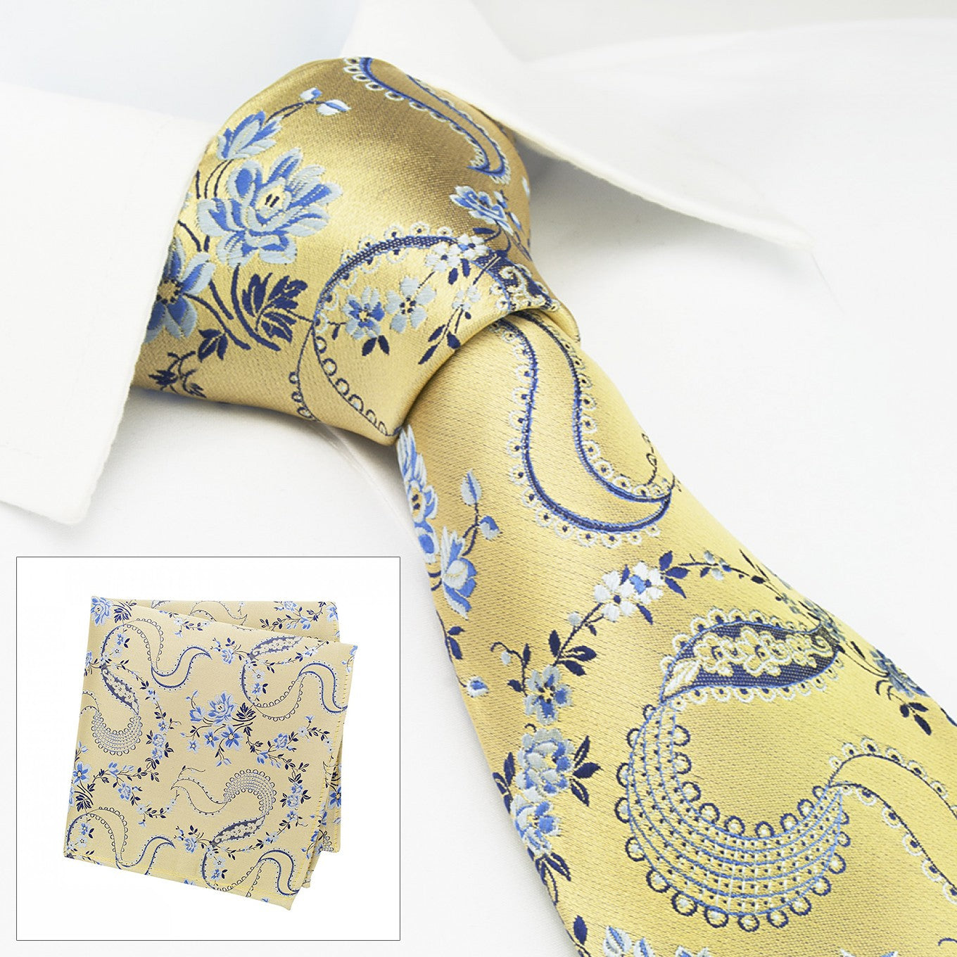 Gold & Blue Luxury Floral Silk Tie & Handkerchief Set