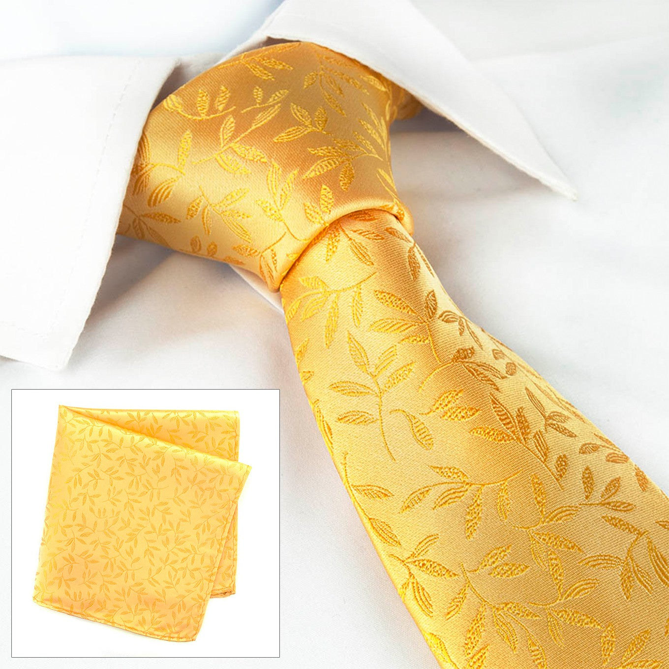 Gold Jacquard Leaf Silk Tie and Handkerchief Set - Luxury gold leaf jacquard silk tie and handkerchief set, suitable for both business and special occasions. The 100% woven silk gives the tie a more textured look and feel. Tie Dimensions: 8.3cm x 148cm - Handkerchief Dimensions: 30cm x 30cm