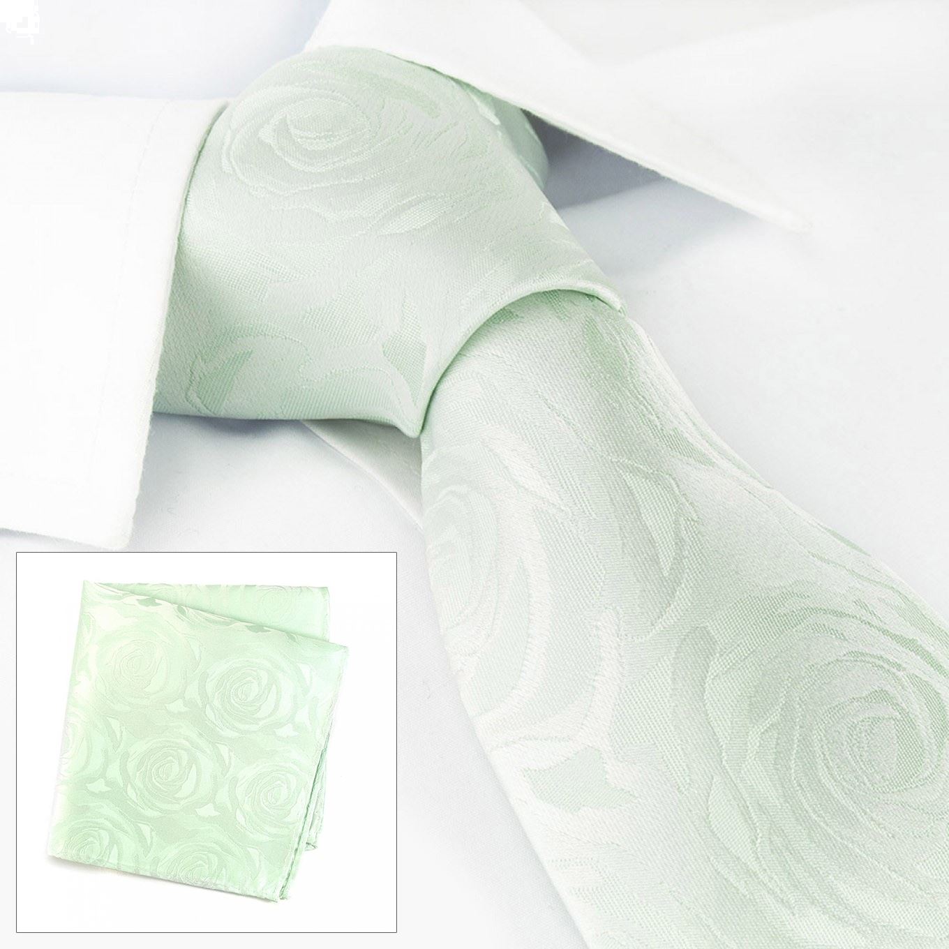 Pastel Green Rose Luxury Woven Silk Tie and Handkerchief Set - Made using 100% fine silk, this beautiful matching tie and handkerchief set is hugely popular for weddings and special occasions. Tie Dimensions: 8.0cm x 148cm Handkerchief Dimensions: 30cm x 30cm