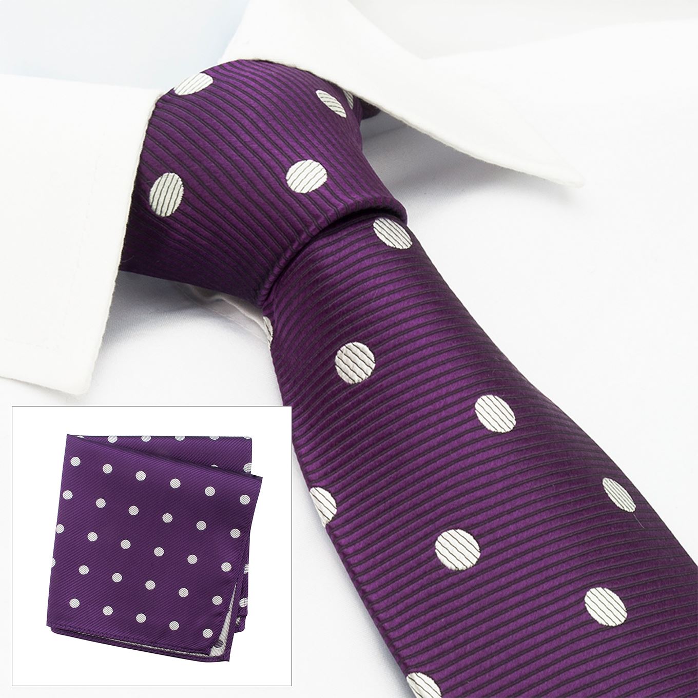Purple Silk Tie & Handkerchief Set With White Polka Dots