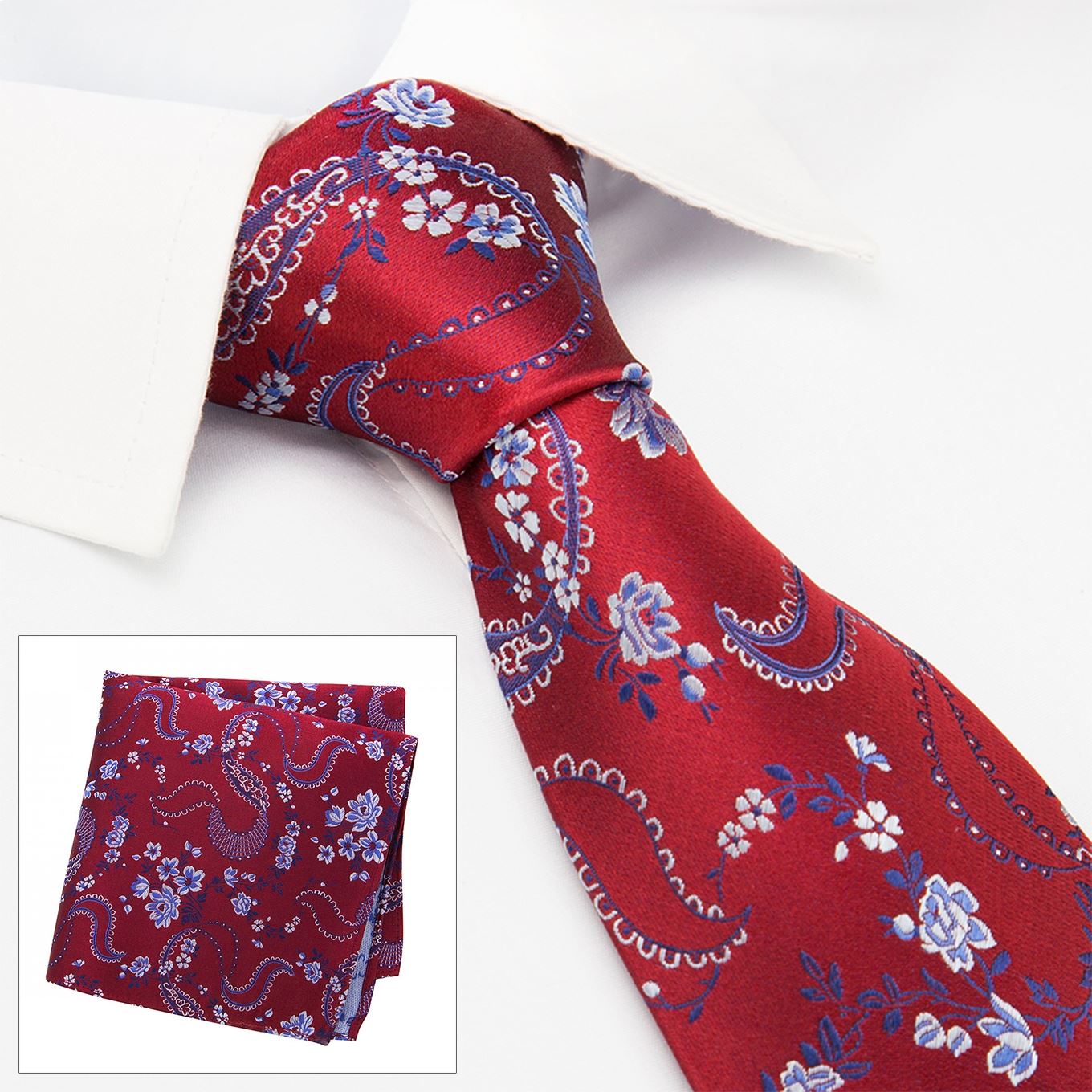 Red and Blue Luxury Floral Silk Tie and Handkerchief Set - Made using 100% fine silk, this beautiful matching tie and handkerchief set can be worn for business, special occasions or weddings. Tie Dimensions: 8.0cm x 148cm Handkerchief Dimensions: 30cm x 30cm